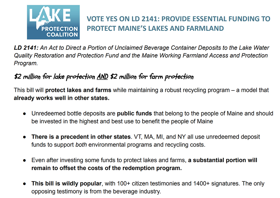 Support LD2141meiklekatie2 days ago1 min readPlease contact your State Senator and urge them to support this legislation to protect Maine's lakes and farmlands!Find your Senator's Contact Information HERE.